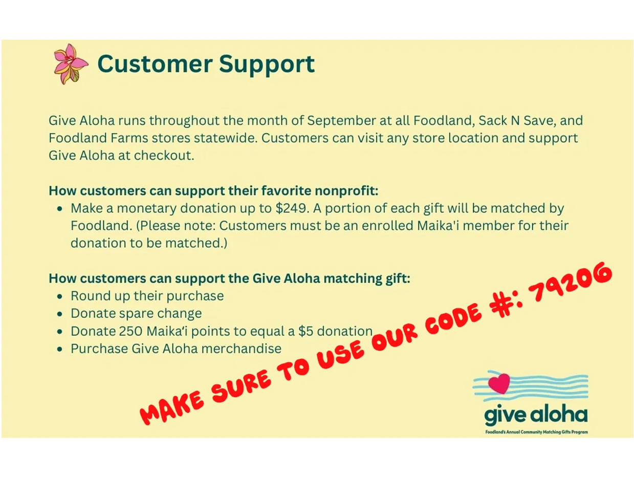 Emergency Animal Care & Help has been accepted as a grantee for the Give Aloha program! Give Aloha runs throughout the month of September at all Foodland, Sack N Save, and Foodland Farms stores statewide. Customers can visit any store location and donate to the Give Aloha organization of their choice at checkout. A code is assigned to each organization for donation tracking and the code for EACH is 79206.